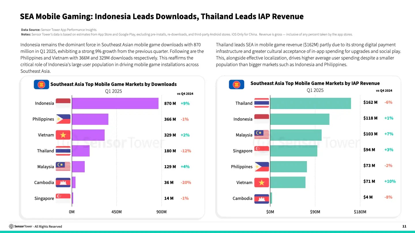 Southeast Asia’s mobile gaming market saw impressive growth, with 1.93 billion downloads in Q1 2025—up 3% from the previous quarter, according to Sensor Tower. Indonesia leads with 870 million downloads, followed by the Philippines and Vietnam.